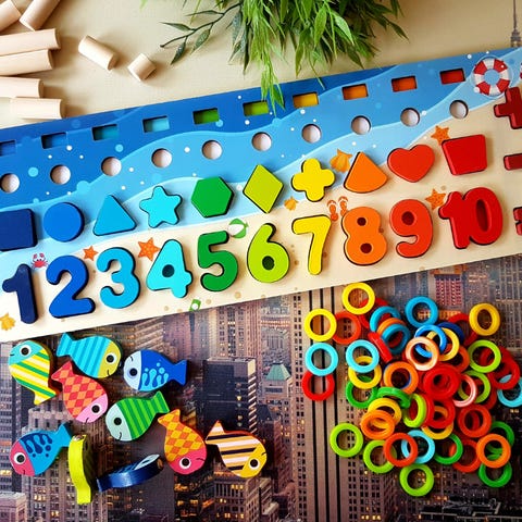 Morsomt og lærerikt trespill for barn fra 3 år. Barna trer fargede trebrikker på snor og lager en søt, fargerik larve. Perfekt for å øve finmotorikk og lære farger.