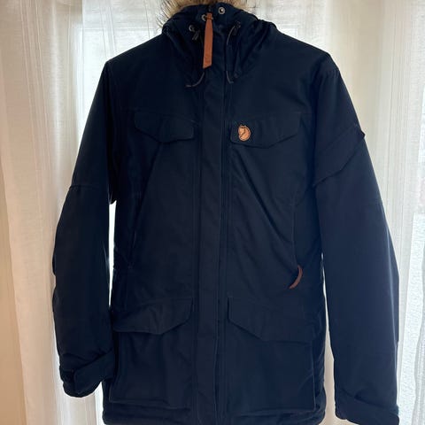 Foret Fjällräven Nuuk Parka jakke for dame i størrelse XS. Jakken er mørkeblå. Modellen, har fast hette, hel glidelås foran med klaff, samt flere utvendige og innvendige lommer med glidelås og knapper. To store innerlommer i mesh, supre til å ha med ekstra klær. Hel og fin jakke.