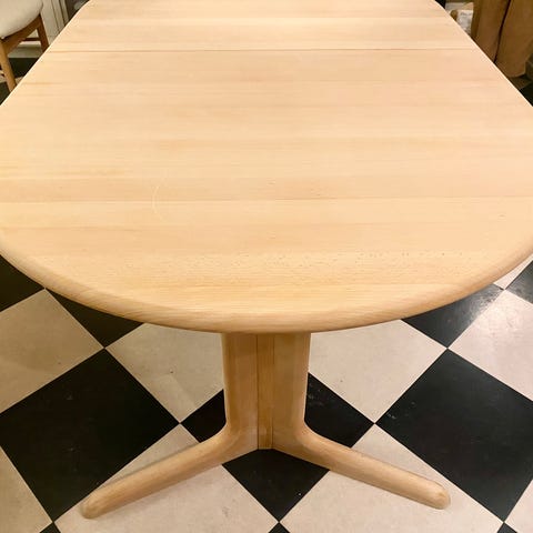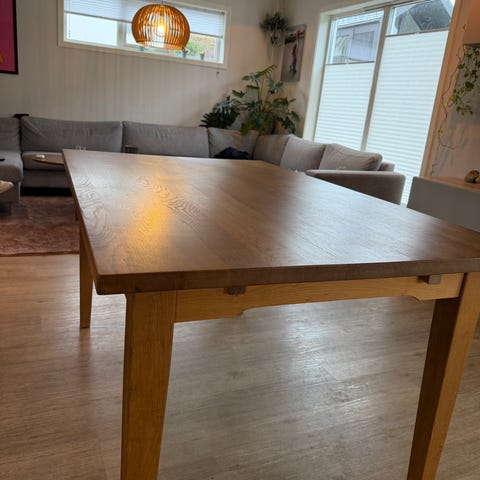 Pent brukt spisebord fra Skovby i hvitoljet eik. Bordet har en lengde på 200 cm og kan utvides til hele 356 cm ved bruk av 3 de ileggsplatene som ligger under bordplaten i eget kammer (se bilde). God sitteplass for 8 personer, og 14 personer når bordet trekkes ut.