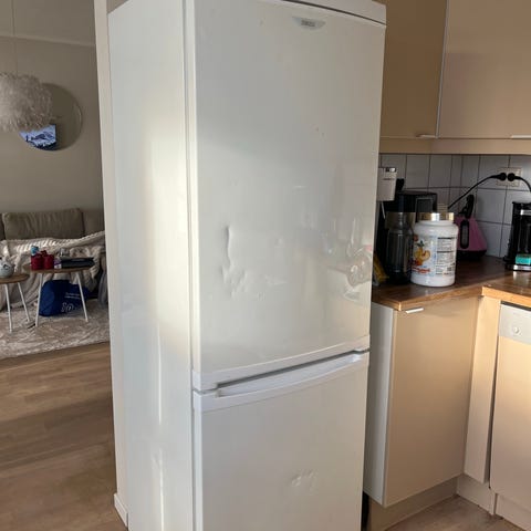 Frysedelen har 2 hull i plastkledningen ved skuffeåpningen. Se bilder. Derfor gis bort.