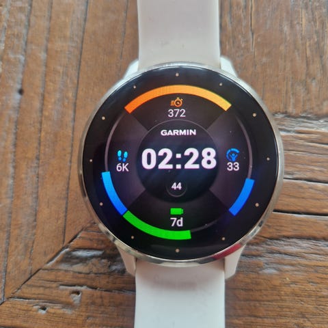 Garmin Venu smartklokke i hvit farge, rosegull ramme, rund berøringsskjerm. Klokken har aktivitets- og treningsfunksjoner. Søk opp klokka på nett for å lese om ulike funksjoner.