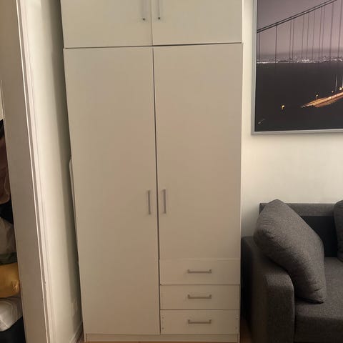 2 stk helt like standard, hvite garderobeskap. Ukjent merke. Synlige bruksmerker noen steder, men stort sett på innsiden. Det éne skapet har en løs bakplate, men den kan spikres fast igjen.