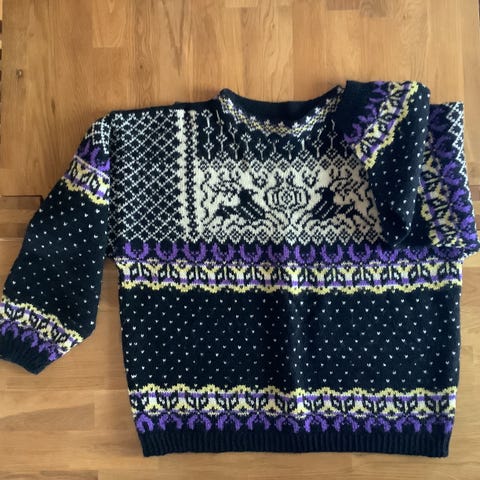 Kjempefin strikket Lillehammer genser. Svært pent håndarbeid. Selges da den dessverre er for stor for meg. Det har vært fikset et lite hull i den, noe som har laget en liten ujevnhet i mønsteret. Dette er ikke spesielt synlig, og er ringet inn på bilde.