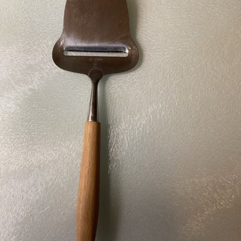 Pent brukt ostehøvel, som trives både med geitost, Norvegia og Jarlsberg, selges til en som er glad i ost. Treskaft. Ser ut som bjørk, men kan ikke si det sikkert. Høvelen er pen, og i god stand. Kan sendes mot at kjøper betaler portoen.