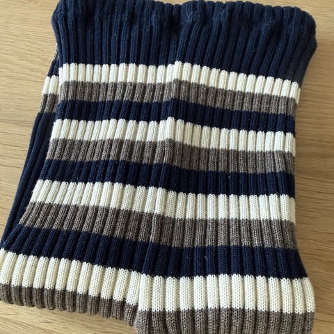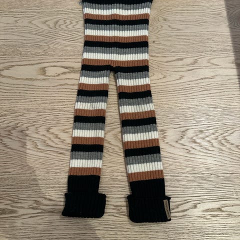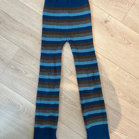 Nøstebarn ullbukse i ribbestrikket merinoull, størrelse 98./110. Buksen er flerfarget med horisontale striper og ensfargede ribbekanter nederst på bena. Unisex-modell som passer både jenter og gutter. Strikk i livet for god passform. Egnet som varm og myk hverdagsbukse eller som lag under yttertøy i kjøligere vær.