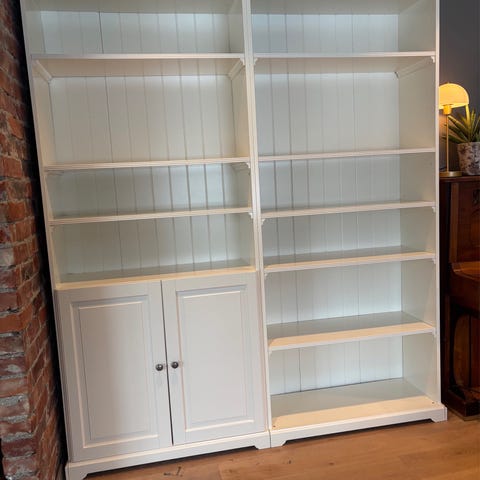 Klassisk vakker bokhylle i landlig stil. Laget av heltre/ MDF) med flere justerbare hyller. Kan lett demonteres og er aktuelt demontertu for frakt. noen små bruksmerker på hyller. Klassisk vakker bokhylle. Kjøpt på nova Solo i Larvik. Må hentes. Pris kan diskuteres ved snarlig avhenting.