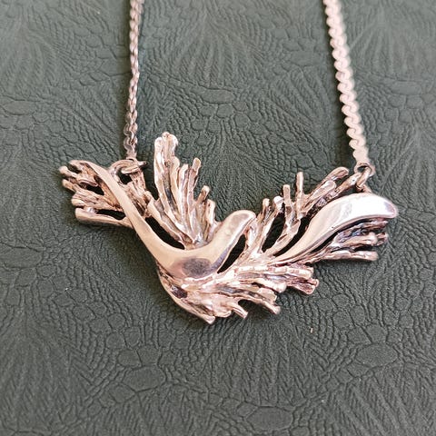 Anheng og kjede, begge i sølv til salgs. Anhenget er stemplet aha 925S og kjedet er stemplet aha 925S. Anhenget er ca. 3,3 cm bredt og ca. 1,8 cm høyt. Total vekt er ca. 7,8 gram.