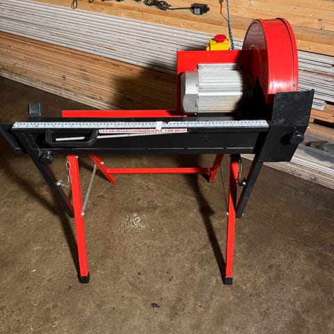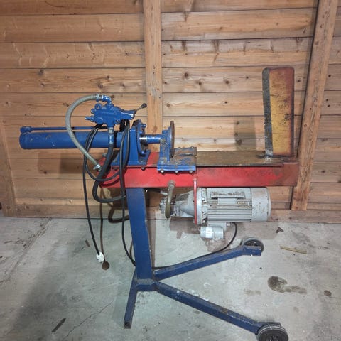 Elektrisk vedmaskin av typen Tysksagen, egnet til kapping og bearbeiding av ved. Maskinen står på fast stativ og har elektrisk motor med start- og stoppknapper. Konstruksjonen er i metall med rød og grå utførelse. Passer til bruk i vedproduksjon og annet arbeid der det er behov for effektiv kapping av trevirke. Nærmere tekniske spesifikasjoner som effekt, bladstørrelse og kapasitet er ikke oppgitt og bør eventuelt avklares med selger.