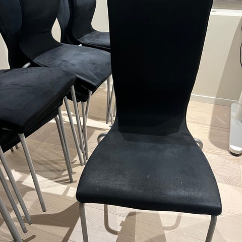 Selger Bontempi (ukjent modell) stoler. Stolene er i svart skinn og har ben i metall (sølvfarget). Passer bra til en spisegruppe. Ligner denne modellen https://www.bontempi.it/en/malik-flex-4064/ eller https://www.bontempi.it/en/nata-4014/.