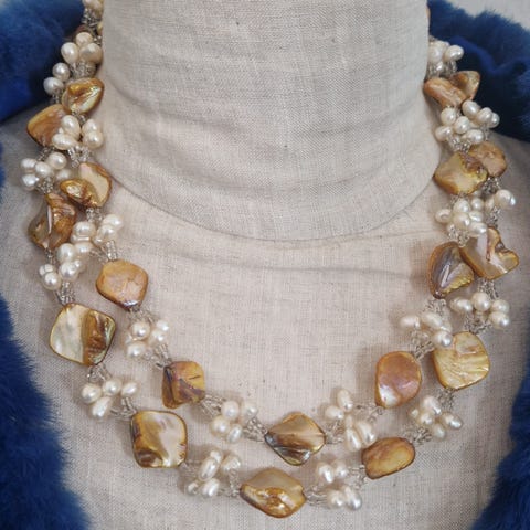 Armbånd i skjell/perlemor til salgs. Finner ingen stempler. Laget til slik at det ligger dobbelt rundt armen. Elastisk i størrelsen (med strikk).