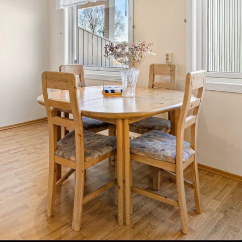 4 eldre solide stoler i tre som i 2006 ble malt og trukket om pluss et spisebord som også ble pusset og malt i en hvit farge. Ser litt antikkt ut, har behov for en liten rens/vask, men ellers fungerer alt som det skal. Gode stoler å sitte på. Bordet er rundt og kan trekkes ut (plate medfølger, men den er ikke malt). Tar relativt liten plass så passer fint på mindre kjøkken eller om du har liten plass. Selges da vi har flyttet og ikke lengre har mulighet til å oppbevare det. Send melding om du ønsker mål/flere bilder.