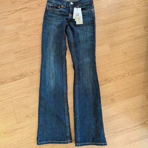 Jeansen har en komfortabel passform med vide ben og klassisk mid blue vask. Lappen er fortsatt på – aldri brukt.