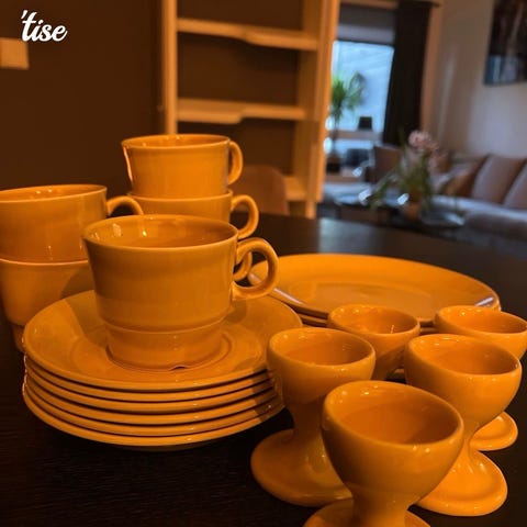 Savner du disse? Da er de dine. Ubrukte kaffekopper og skål på 15 cl fra den herlige serien Citron. Serien er designet av Ferdinand Finne og ble lansert i 1995. Delene er produsert av feltspatporselen og tåler både rengjøring i oppvaskmaskin, samt mikrobølgeovn. NB! Disse er gule, uten sitron 🍋 på. Produseres ikke lenger. Kan selge separat, skriv en pm. 150 kr per stykk. Selges da de fortjener å bli brukt, kanskje av deg? 💚💛