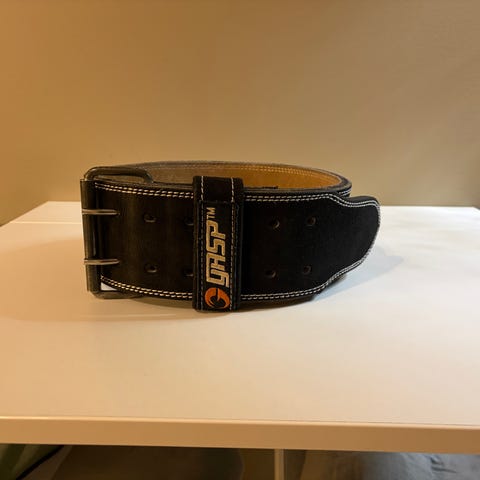 Gasp treningsbelte i skinn i svart farge med lys innside, størrelse large. Beltet har kraftig spenne i metall og flere hull for justering av størrelse. Bred utforming gir støtte rundt midjen ved styrketrening og vektløfting.