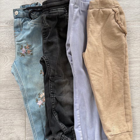 9 bukser + en joggedress med dinosaurmotiv. Str 92 og 98.