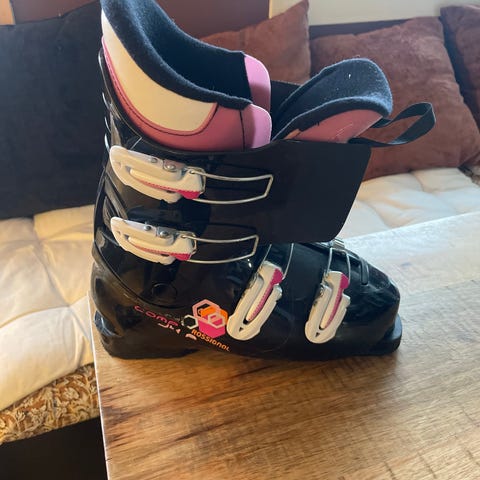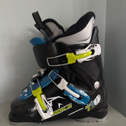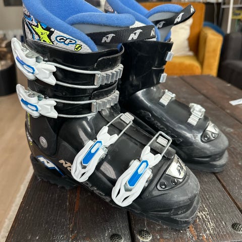 Alpina alpinstøvler for barn i størrelse 22,5. Støvlene har hard ytterskall i plast med justerbare spenner foran og over vristen for god tilpasning. Fargekombinasjon blå og svart med grafiske detaljer. Myk, polstret innerstøvel for komfort og varme. Passer til vanlige alpinbindinger for barn.