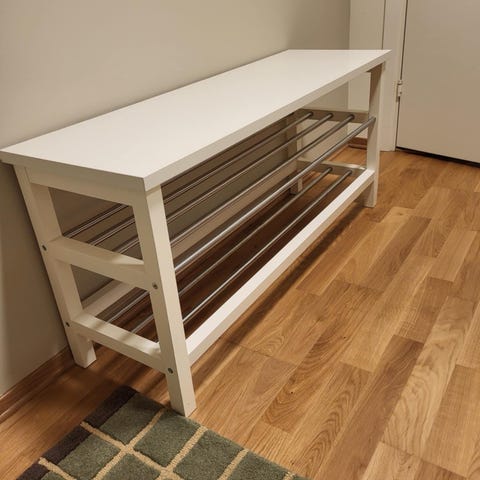 Selger denne praktiske og pene entrébenken fra IKEA sin serie Tjusig. Benken har plass til flere par sko, er dekorativ og man kan også sitte på den når man for eksempel skal ta på seg sko. Nypris er kr. 600,-. Les mer på IKEA sin hjemmeside https://www.ikea.com/no/no/p/tjusig-entrebenk-med-skoplass-hvit-70152702/