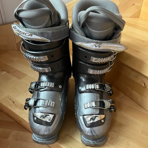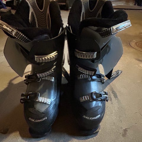 Salomon SX skistøvler i sølvfarge. Modellen har fire justerbare spenner og powerstrap. Passer til bruk i alpinbakke. Yttermateriale i plast med polstret innersko for støtte og komfort. Egnet for voksne brukere, unisex. Str 26-26.5, tilsvarer 41 i eur.