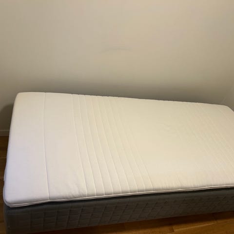 Bohus seng med madrass i nøytral grå farge. Sengen har en enkel og rett ramme med ben, og madrassen ligger oppå rammen. Passer som enkeltseng på soverom, gjesterom eller hybel.