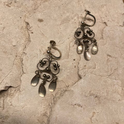 Vintage halsknapp/halssølje i sølv med fine filigransdetaljer og hengende løv.