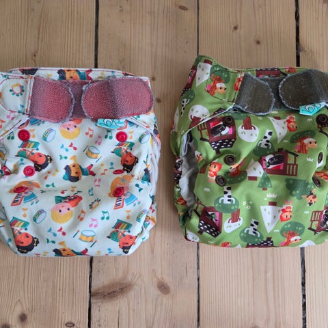 To nyfødtbleier Born Smart fra Smart Bottoms selges rimelig da de ikke brukes. Størrelsen passer nyfødt, kan justeres noe med knepping. Smart design foran for å holde navlen fri og tørr.