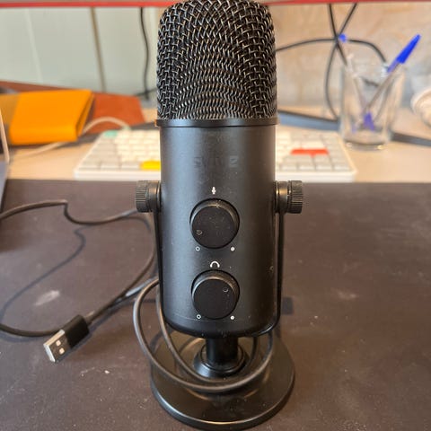 Nesten unbrukt Blue Yeti USB-mikrofon med bordstativ og popfilter i svart. Mikrofonen har innebygde kontroller for gain, mute og volum, samt valg av flere opptaksmønstre via bryter på baksiden. Leveres med USB-kabel for tilkobling til datamaskin og separat popfilter som monteres foran mikrofonen for å redusere plosiver og pustelyder. Egner seg for taleopptak, streaming, videomøter og innspilling ved skrivebord.