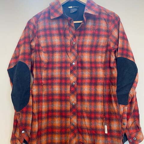 Norrøna skjorte for dame i størrelse L. Skjorten er laget i ull og har et flerfarget rutemønster i varme toner. Modellen har lange ermer med kontrastforsterkninger på albuene og klassisk krage. Passer til fritidsbruk og tur, eller som et mellomlag i kjøligere vær.