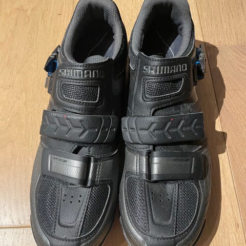 Shimano sykkelsko i størrelse 42. Skoene er svarte med borrelås- og spenneremmer for justerbar passform. Sålen har grovt mønster og feste for klosser til klikkpedaler, egnet for terreng- eller tursykling. Overdelen er laget i syntetisk materiale med ventilasjonsfelt for bedre lufting. Passer til syklister som bruker sykkelsko med klikkpedaler i størrelse 42.