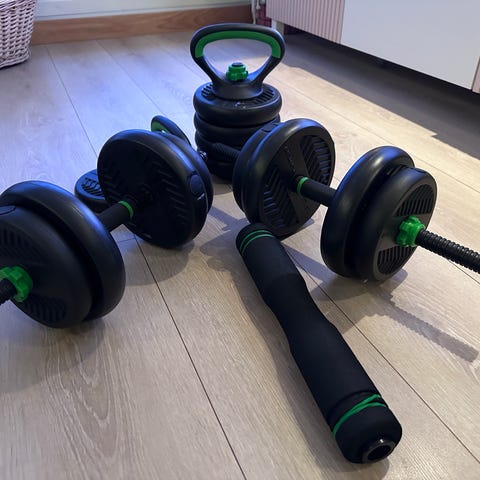 Sett med krom manualvekter i koffert med stenger, vektskiver og lukkemekanismer for justering av vekt. Inkluderer også kettlebell på 8 kg og treningsstropp/strikk. Egnet til styrketrening av hele kroppen hjemme eller på hytta, med mulighet for ulike øvelser for armer, skuldre, rygg og bein. Vektene kan tilpasses etter ønsket belastning ved å legge til eller fjerne skiver.
