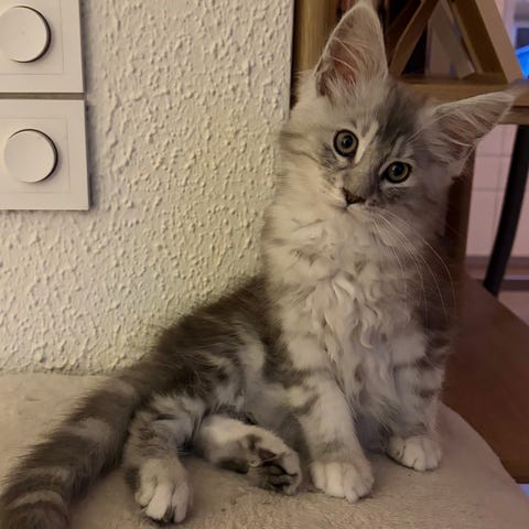 Hun er oppvokst midt I stuen så godt vandt med hverdagens liv og lyder. Prada er ei leken frøken som kattunger flest, men kryper gjerne opp i sofaen om kvelden for litt nærhet og kos.