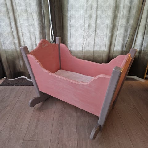 IKEA vugge i tre med rosa sidepaneler. Vuggen står på meier som gjør at den kan vugges forsiktig fram og tilbake. Passer til spedbarn, og kan plasseres på soverom eller barnerom. Klassisk utforming med hode- og fotende i treverk og rette langsider. Madrass og sengetøy følger ikke nødvendigvis med og må eventuelt avklares med selger.