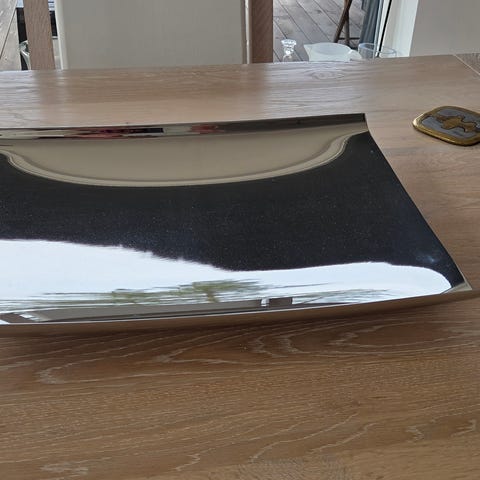 Georg Jensen bolle i blankpolert rustfritt stål. Formen er organisk og buet, med myke linjer som gjør den egnet som fruktbolle, serveringsbolle eller som dekorativt fat på bord eller skjenk. Overflaten er speilblank, og bollen har inngravert Georg Jensen-logo på innsiden. Passer inn i moderne interiør og kan brukes både til servering og som pyntegjenstand.