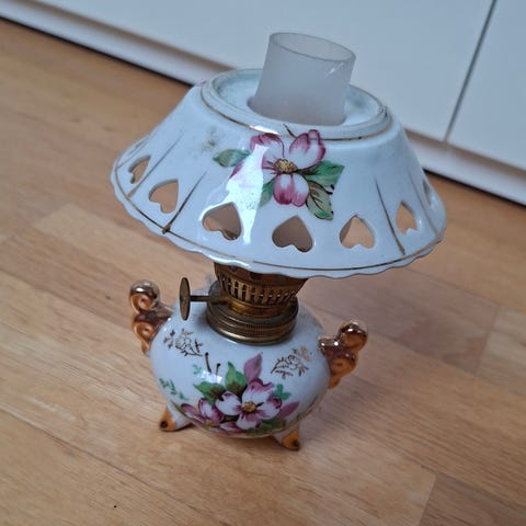 Vakker og nostalgisk oljelampe i porselen med messing detaljer.