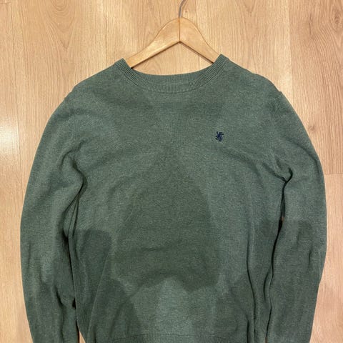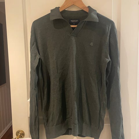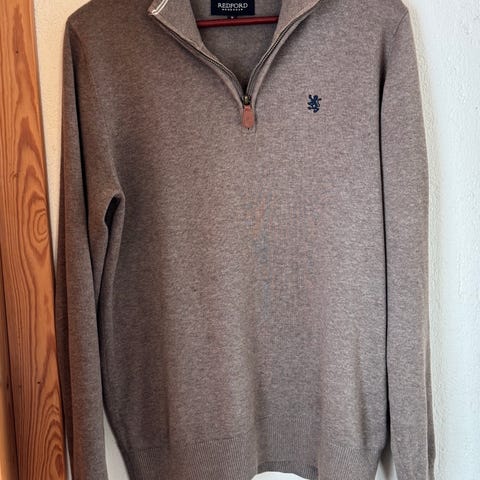 Redford genser for herre i størrelse S. Genseren er grå og laget av bomull. Den har rund hals og flettestrikket mønster på hele plagget. På brystet er det et lite brodert merke. Passer til hverdagsbruk og kan kombineres med både jeans og chinos.