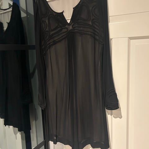 Sort, ubrukt selskapstopp med paljetter fra Floyd. Som ny. Den har ikke lapp som viser størrelsen, men passer som M/L. Stoffet har god stretch. Materialet er transparent og paljettmønsteret gir et ekstra feminint uttrykk. Toppen har trompetermer og splitt i sidene nederst. Lengde: 80 cm. Kan sendes. Kr.300