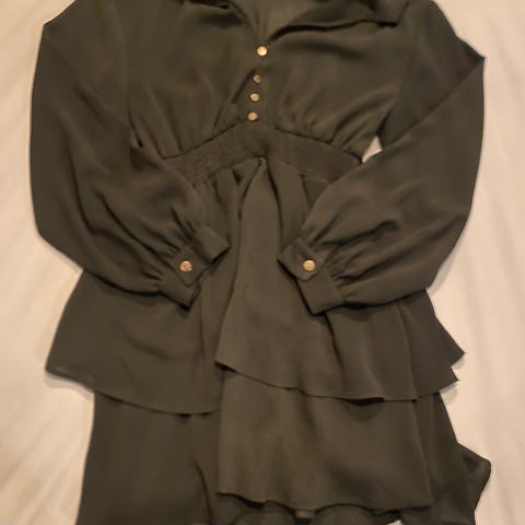 Zara sommerkjole for dame i størrelse S. Kjolen er laget av bomull og har et flerfarget mønster i hovedsakelig grønt og hvitt. Modellen har lange ermer, krage og knappelukking foran, samt tilhørende knytebelte i livet. Lengden er kort til middels, egnet som sommerkjole til hverdagsbruk eller enkle anledninger.