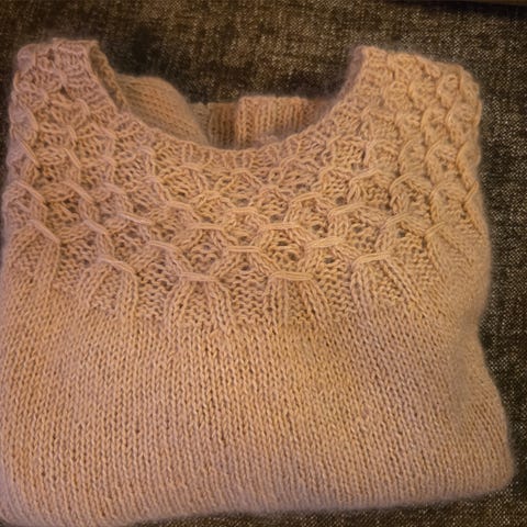 Digg, myk og god, hjemmestrikket. Er ca en M. Bredde fra under erme og over til andre side 60 cm