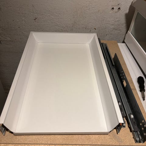 Skuffene er brukt i et kjøkken og noen år gamle men hele og fine. Skinnene går fint, men det er nok noe svakere demping enn i en helt ny skuff.