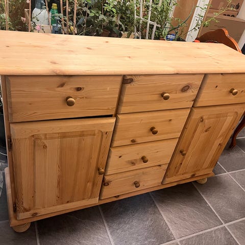 Solid skjenk, brunbeiset treverk. God lagringsplass. Brukt til lagring av DVDer og ekstra servise.