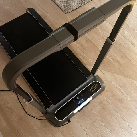Kingsmith WalkingPad tredemølle. Kompakt elektrisk gåbånd/tredemølle beregnet for innendørs bruk. Display i front viser grunnleggende treningsinformasjon, og enheten har betjeningsknapper lett tilgjengelig. Egner seg til gange og lett trening hjemme eller på kontor, og kan brukes på mindre gulvarealer der det er behov for en plassbesparende løsning.