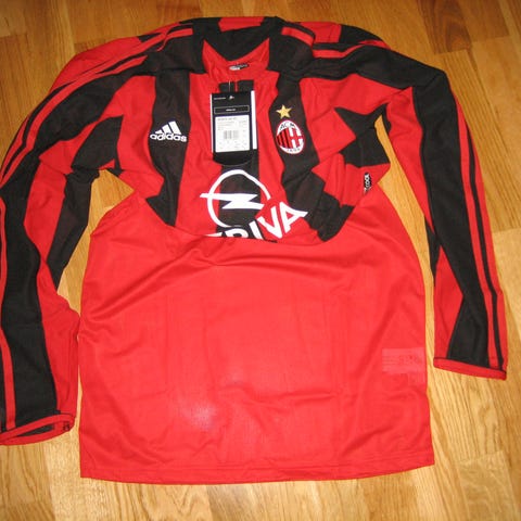 Lotto Milan A.C. fotballdrakt med lang erm i røde og svarte striper. Drakten har krage, fronttrykk med sponsorlogo og klubbmerke samt stort nummer 10 på ryggen. Produsentinformasjon og vaskelapper sitter i halsen. Passer til bruk som supportereffekter eller til fritidsbruk. Størrelse M. Meget sjelden drakt!