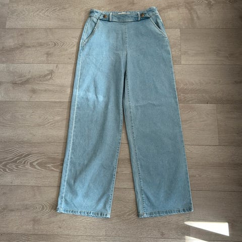 H&M jeansbukse for dame i størrelse 34 med livvidde W26. Buksen er i blå denim av bomull. Modellen har høyt liv med belte i samme stoff, skrålommer foran og påsydde lommer bak. Passer til hverdagsbruk og kan kombineres med ulike topper og gensere
