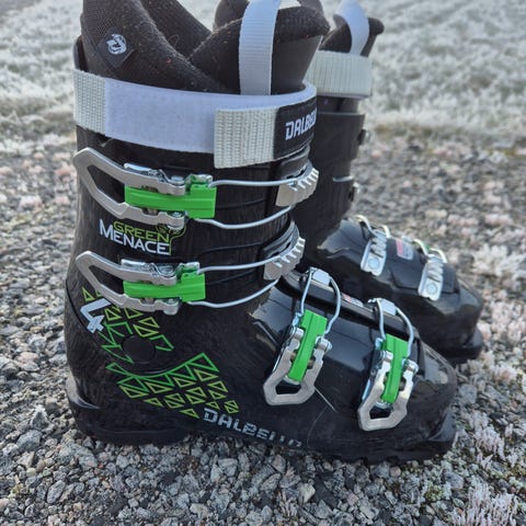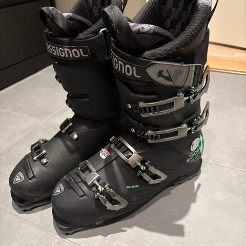 Selger mine knapt to sesonger brukte Head Vector alpinstøvler i sort og grønn layout.