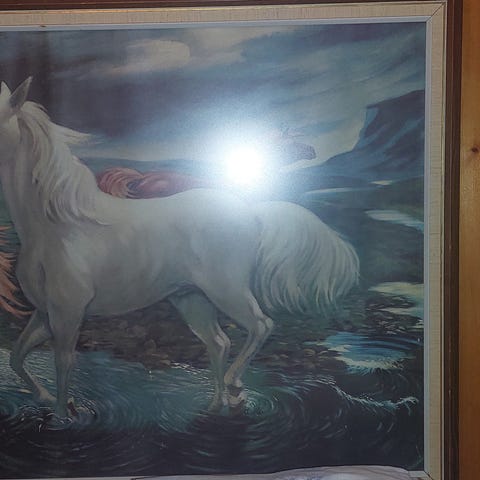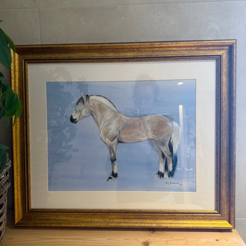 Oljemaleri (med innslag av blyant) av hest i bevegelse.