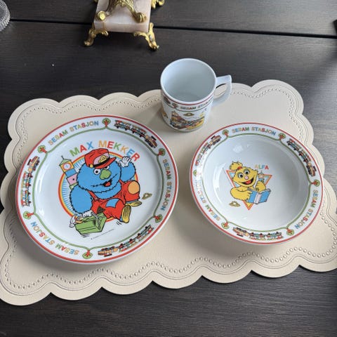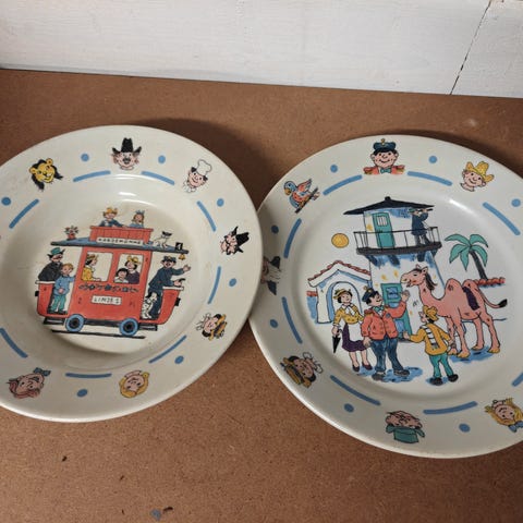 Flat og dyp barnetallerken, ingen skår eller nagg. Max mekker på den flate og Alfa på den dype.