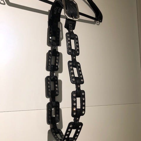 Midjebelte med bredt, sort strikk og imitert skinnfront. Har en liten lomme i front som lukkes med glidelås og som passer til kort, lebestift o.l. Beltet har tre hull for lengdejustering og måler på det ytterste, når helt strukket ut: 48cm. Bredden på beltet er 8cm. Kan sendes. Kr.100