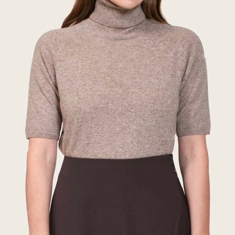 Pierre Robert Capsule sett med ribbestrikket genser og skjørt til dame. Farge grønn. Genseren har kort erm og høy hals, skjørtet er knelangt med elastisk linning. Størrelse M på genser og M/L på skjørt. Materiale ifølge lapp: ullblanding med blant annet polyester, viskose, ull og alpaka. Egnet som hverdagsplagg eller til mer pyntede anledninger. Vaskes for hånd med ullvaskemiddel etter anvisning på plagget.