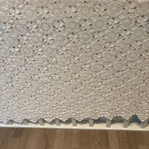 Heklet sengeteppe med blondemønster i offwhite./ hvit. Teppet har blomsterdetaljer og dekorative frynser langs kanten. Passer til bruk som sengeteppe eller som dekorativt overkast på seng i soverom. Materialet fremstår som heklet garn/ tråd, egnet for innendørs bruk. Størrelse 220 x 180