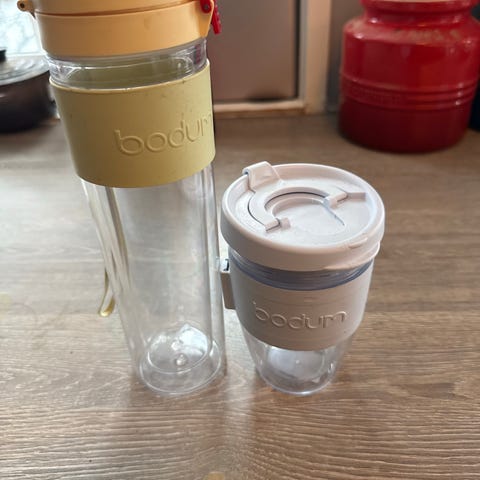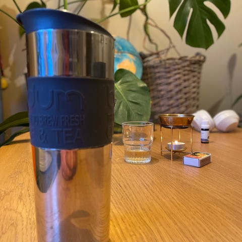 Termosflaske i glass, med bambuskork, te-sil og tøytrekk for beskyttelse og varmeisolering.