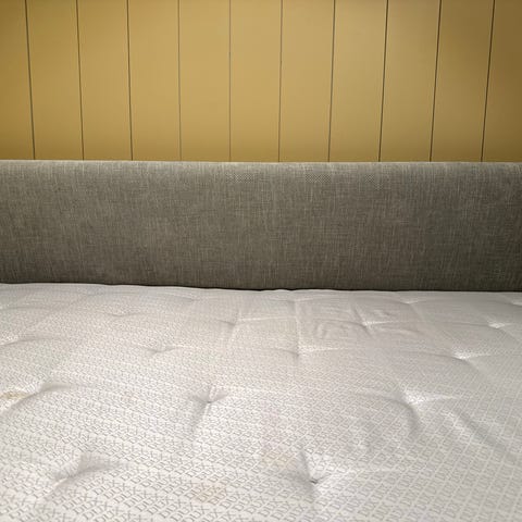 Georg Jensen seng med polstret hodegavl. Sengen har en rett, enkel ramme og en grå tekstiltrukket hodegavl med knappdetaljer. Madrassen har en fast og en myk sone. Størrelse 150x200 cm. Overmadrass fra Jysk kan følge med om ønskelig(ikke renset)